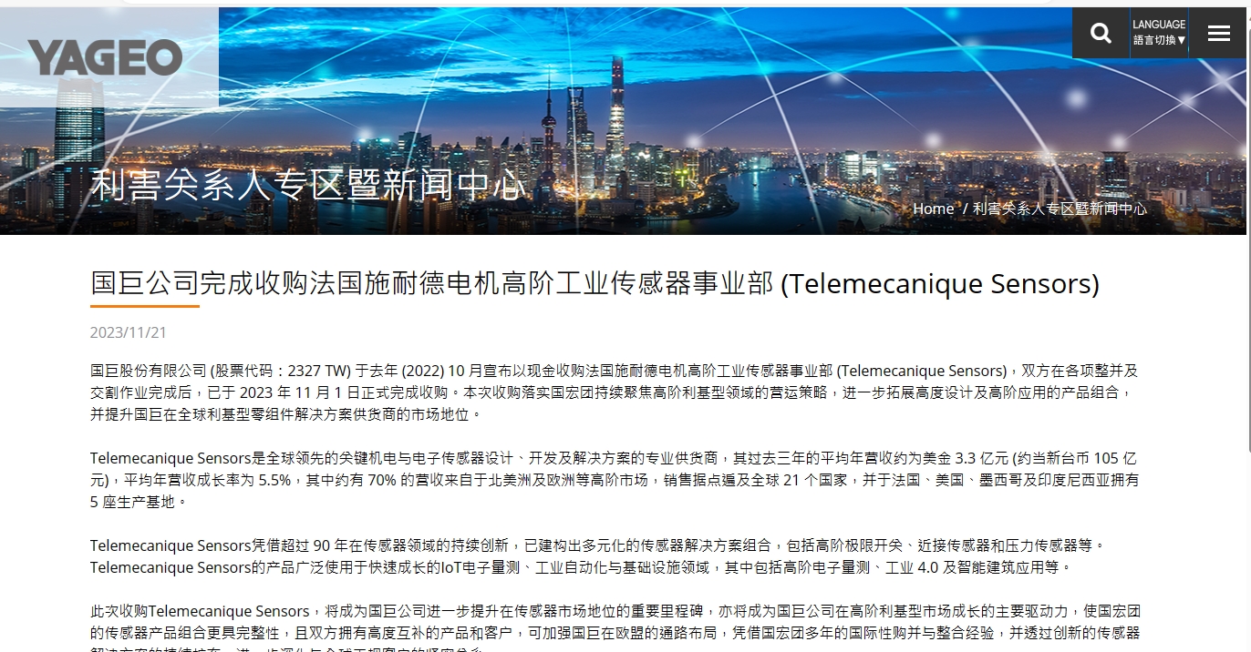 继收购君耀在半导体保护器件成功后,YAGEO国巨电子正式完成对施耐德传感器事业部的收购,继续工业控制和保护领域发力。